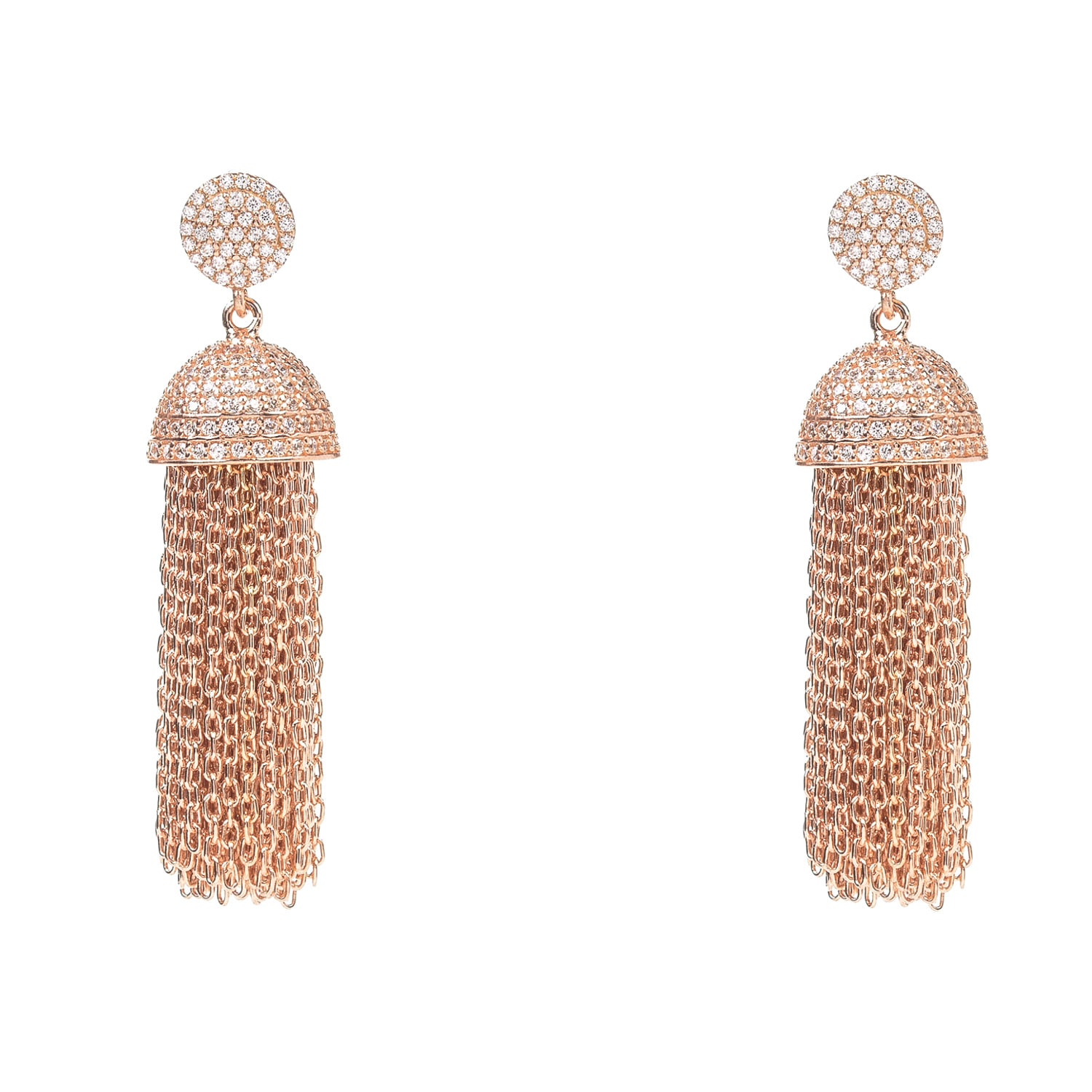 22ct rose gold vermeil chain tassel earring Inspired from the domes of Byzantium architecture, this LATELITA tassel earring has been adorned with pave set clear crystals and fine mesh chain strands featuring an encrusted hoop top and stud