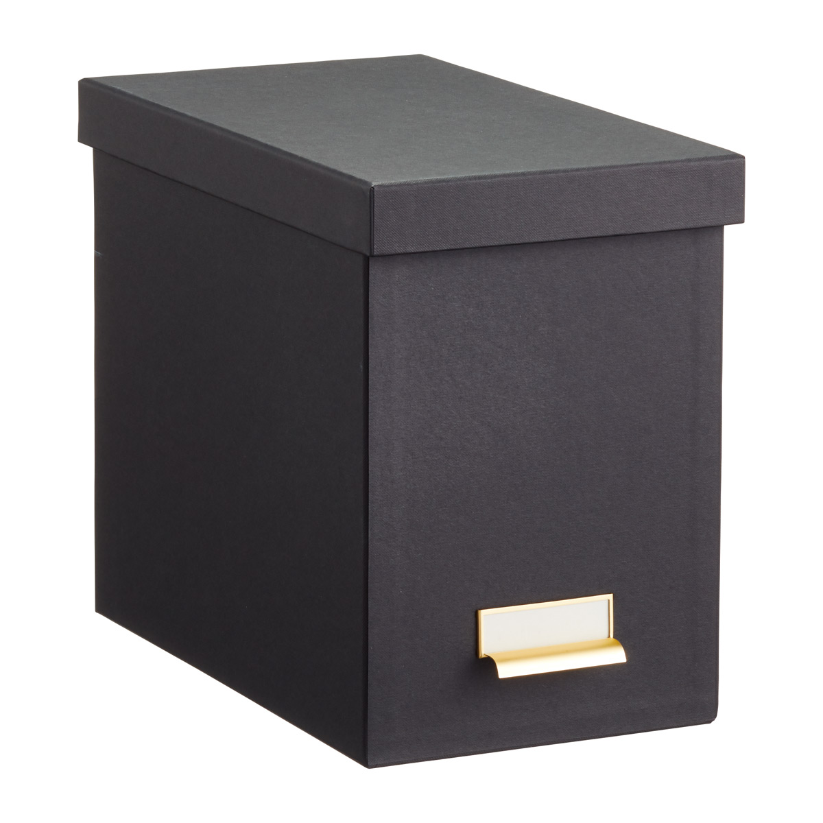 Metal label holders make it easy to identify what you've stored inside, a pull tab helps you remove it from a shelf, and a lid protects all your files from dust