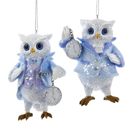 From the Frosted Kingdom Collection Designs depict wise owls dressed in elegantly decorative ice blue blazers, each holding a silver pocket watch Each comes ready-to-hang on a silver cord Recommended for indoor use Fully dimensional ornaments Dimensions: 3.25"H Material (s) : resin Pack of 12 - includes 6 of each style shown
