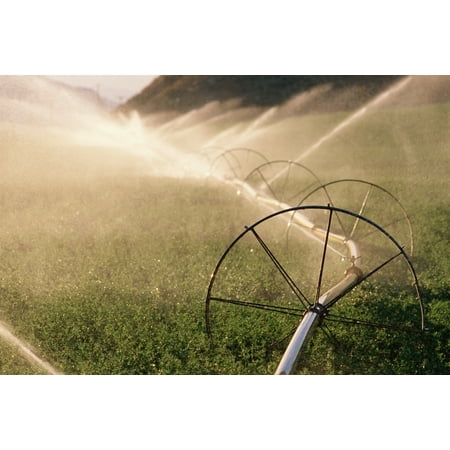 Brand New and Rolled and ready to stretch or frameCanvas Art Title: Sprinkler system with wheels watering cropsCanvas Size: 24 x 36 inches plus an additional 1.5 inches of extra canvas on all 4 sides to allow for easy stretching and/or framingLicensor: Panoramic ImagesArtist: Panoramic Images