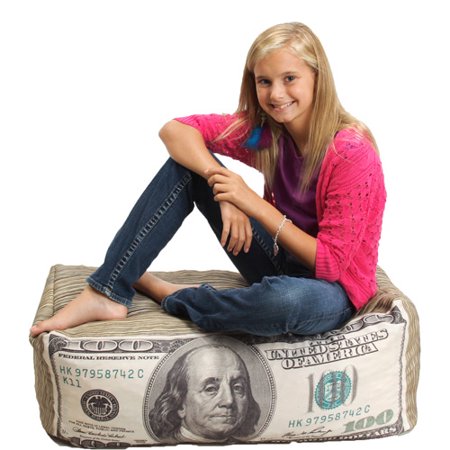 Wow Works Kid's Money Bean Bag Chair:100 dollar bill shaped bean bag chairVery realistic lookingDigitally printedHigh-grade polyester fabricFilled with polystyrene foam beadsDimensions: 34"L x 14"W x 16"HModel# 52322JQuestions about product recalls? Items that are a part of a recall are removed from the Walmart.com site, and are no longer available for purchase