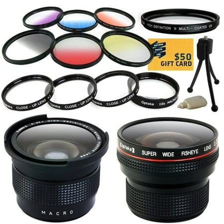 Whats in the box:*Opteka +1, +2, +4 and Macro Close Up Lens Set-Professional High Definition II +1, +2, +4, +10 Close-Up Lens Set Includes pouch-High-index / low-dispersion optical glass-Fully multi-coated, Anti-reflection coating-High speed auto-focus / Infrared compatible-Brand new, Lifetime warranty*0.35x High Definition II Wide Angle Panoramic Macro Fisheye Lens-High Definition HD2 Lens-Front filter thread: 67mm-8 Element Lens-High Quality Crystal Optics-180Deg Degree Capability*0.20X High Definition Professional Super AF Fisheye- High Definition HD2 Lens- High-index / low-dispersion optical glass- Fully multi-coated, every element- Anti-reflection coating- High speed auto-focus / Infrared compatible*Vivitar 6 Piece Graduated Filter Set-Multi-coated Essential Graduated 6 Piece Color Filter Kit-High quality construction-Rotating frame to allow desired placement of color-6 Pocket Filter Wallet-Creative Photography for Skylines and Landscapes*Ultra Violet Haze Multi-Coated Glass Filter-Multi-Coated and heat treated glass to eliminate distortion-Pictures gain brilliance and disturbing blue casts are avoided-Designed to maximize day and night shots by providing maximum light transmission*Digital Camera Lens Cleaning Set-Compact Tabletop Tripod-Digital Camera &