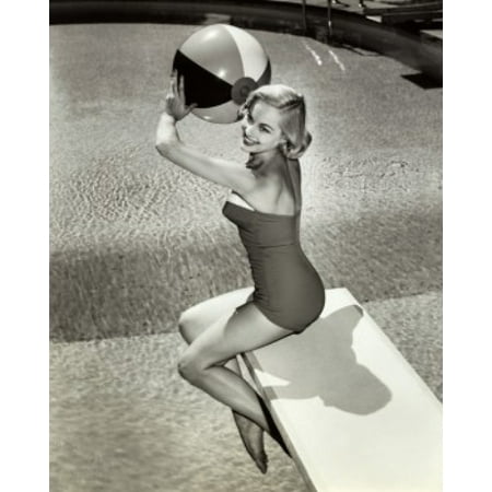 Side profile of a young woman sitting on a diving board holding a beach ball was reproduced on the finest Canvas which captures all of the vivid colors and details of the original art
