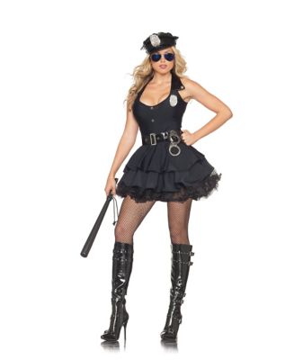 The black halter dress of this police costume features a tiered ruffle skirt
