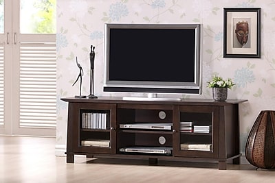 WHI5592FeaturesStyle: ContemporaryEngineered wood frameDark brown (espresso) faux wood grain paper veneer3 Drawers and 2 open shelvesHoles in rear for easy cable managementBaxton Studio collectionTV Size Accommodated: 47"Product Type: TV StandDesign: Open shelving/Enclosed storageFinish: Black