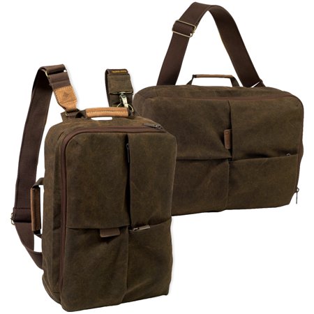 Key Features: Carry as either a backpack or shoulder bag Two interior zipper pockets Rear padded laptop compartment Outer easy-access pockets Two open interior accessory pockets Pockets to hold pens Padded back Adjustable canvas straps Two carry handles Made from natural materials Interior Dimensions: 11.4 x 3.1 x 16.1 in